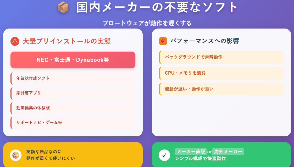 PCの知識があり、不要なソフトを自分で削除(デブロート)できる方なら問題ありませんが、そうでない場合は、余計なソフトが入っていない「メーカー直販モデル」や、シンプルな構成の海外メーカー製を選んだほうが、同じ価格でも快適に動作することが多いです。
