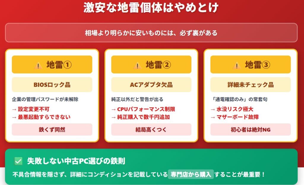 - BIOSロック(パスワードロック)品: 企業の管理パスワードが解除されないまま流出したもの。設定変更が一切できず、最悪の場合、起動すらできなくなる鉄くず同然の個体です。
