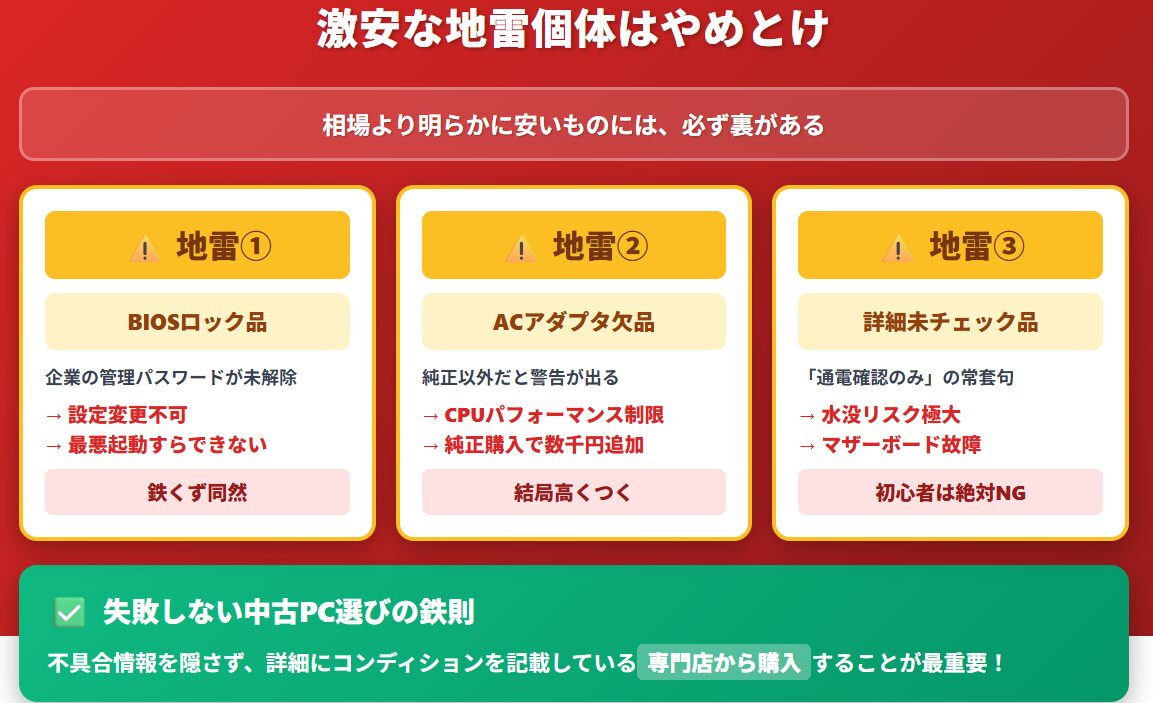 中古PC選びで最も重要なのは「信頼」です。不具合情報を隠さず、詳細にコンディションを記載している専門店から購入することが、失敗しないための第一歩です。