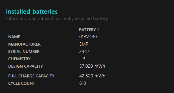 このレポート内に記載されている「Full Charge Capacity(現在の満充電容量)」が、「Design Capacity(新品時の設計容量)」と比較してどれくらい残っているかを確認します。もしこの数値がDesign Capacityの50%〜60%以下になっているなら、そのバッテリーは消耗品としての寿命を迎えていると判断すべきです。