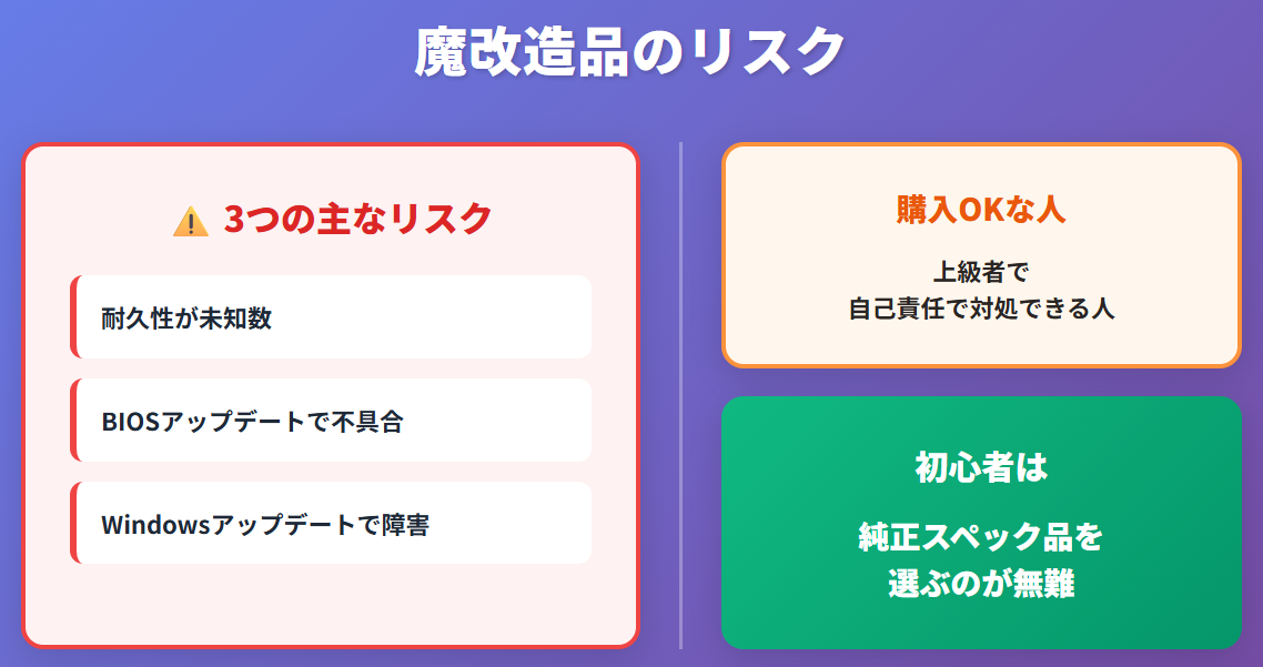 スペックだけ見れば非常に魅力的ですが、これらはメーカーの設計想定外の改造です。耐久性は未知数ですし、将来的にBIOSのアップデートやWindows Updateを行った際に、ハードウェア構成の不一致で不具合が出るリスクもゼロではありません。