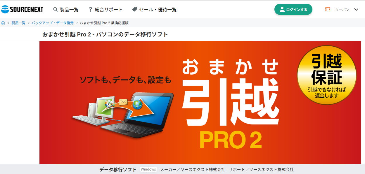 また、万一うまく引越できなかった場合は購入後30日以内なら返金対応、さらに動作はするが引越できなかった場合は購入後1年以内の「引越保証」も用意されているので、はじめてデータ移行ソフトを使う方でも安心して試せます。