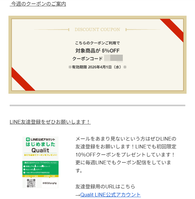 クオリットの公式LINEアカウントを友だち追加することでも、クーポンを受け取れる場合があります。メルマガ登録と同等の特典が配布されることがあり、再入荷通知やシークレットセールの案内もいち早く受け取れるのが魅力です。