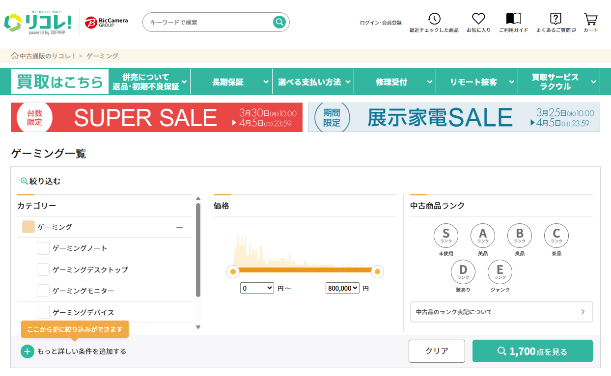 リコレ!ビックカメラグループのソフマップが運営する中古専門サイトで、大手グループならではの安心感があります。